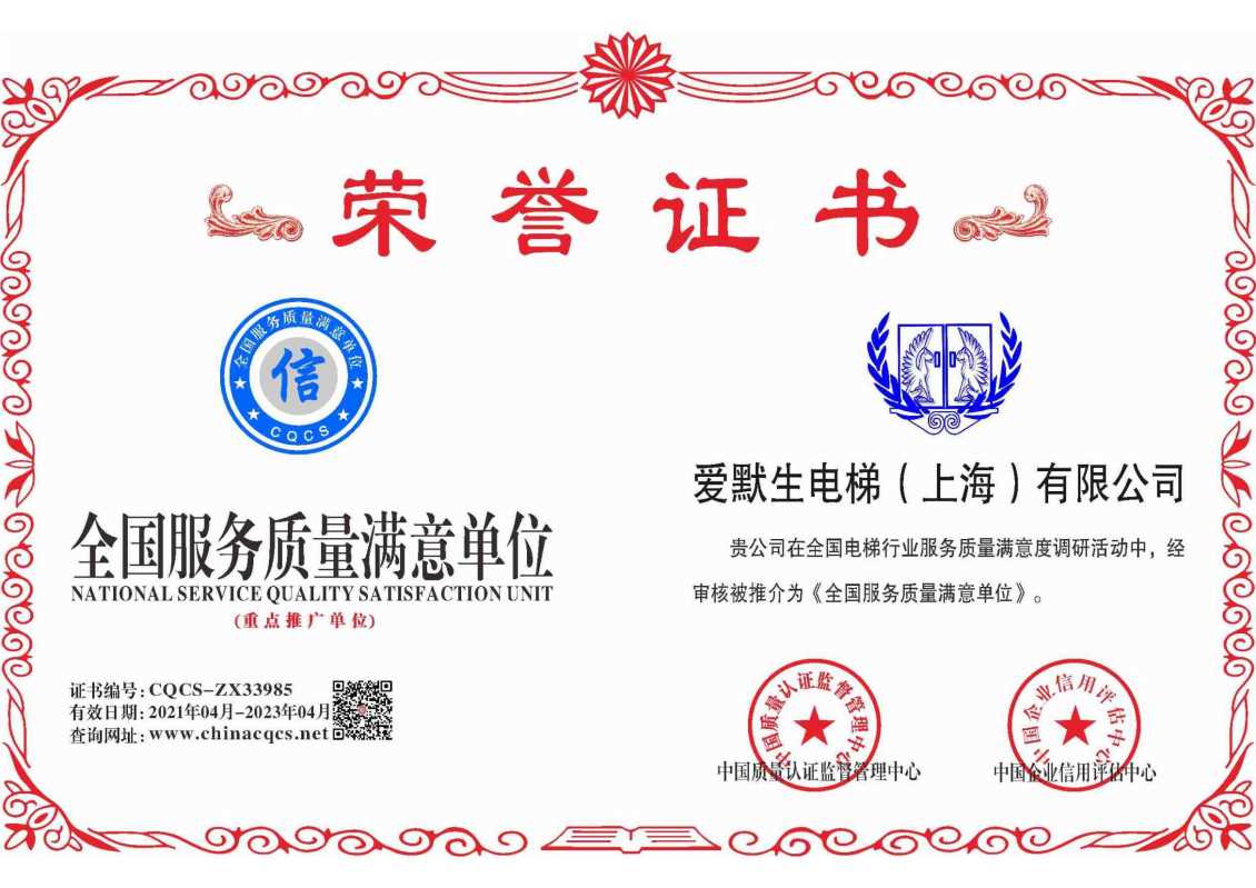全国服务质量满意单位荣誉证书